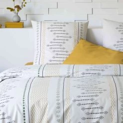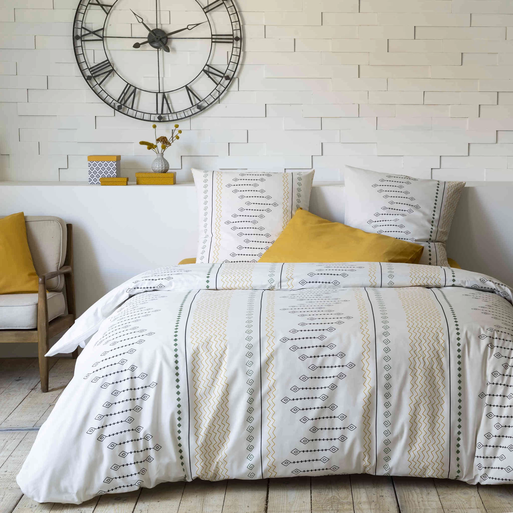 Cette parure de lit prĂ©sente un motif d’inspiration ethnique