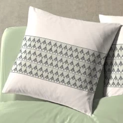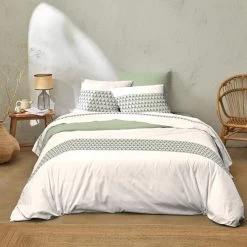 Concernant l’imprimĂ© de la parure de lit, vous retrouverez des motifs gĂ©omĂ©triques sur un fond vert clair au centre de la housse de couette et des taies d’oreillers. Afin qu’elle puisse s’intĂ©grer facilement Ă tous les univers de chambre, elle a Ă©tĂ© imaginĂ©e dans un coloris blanc Ă©purĂ©. L’association du vert et du blanc apportera Ă votre chambre Ă coucher une touche de fraĂ®cheur et de modernitĂ©.