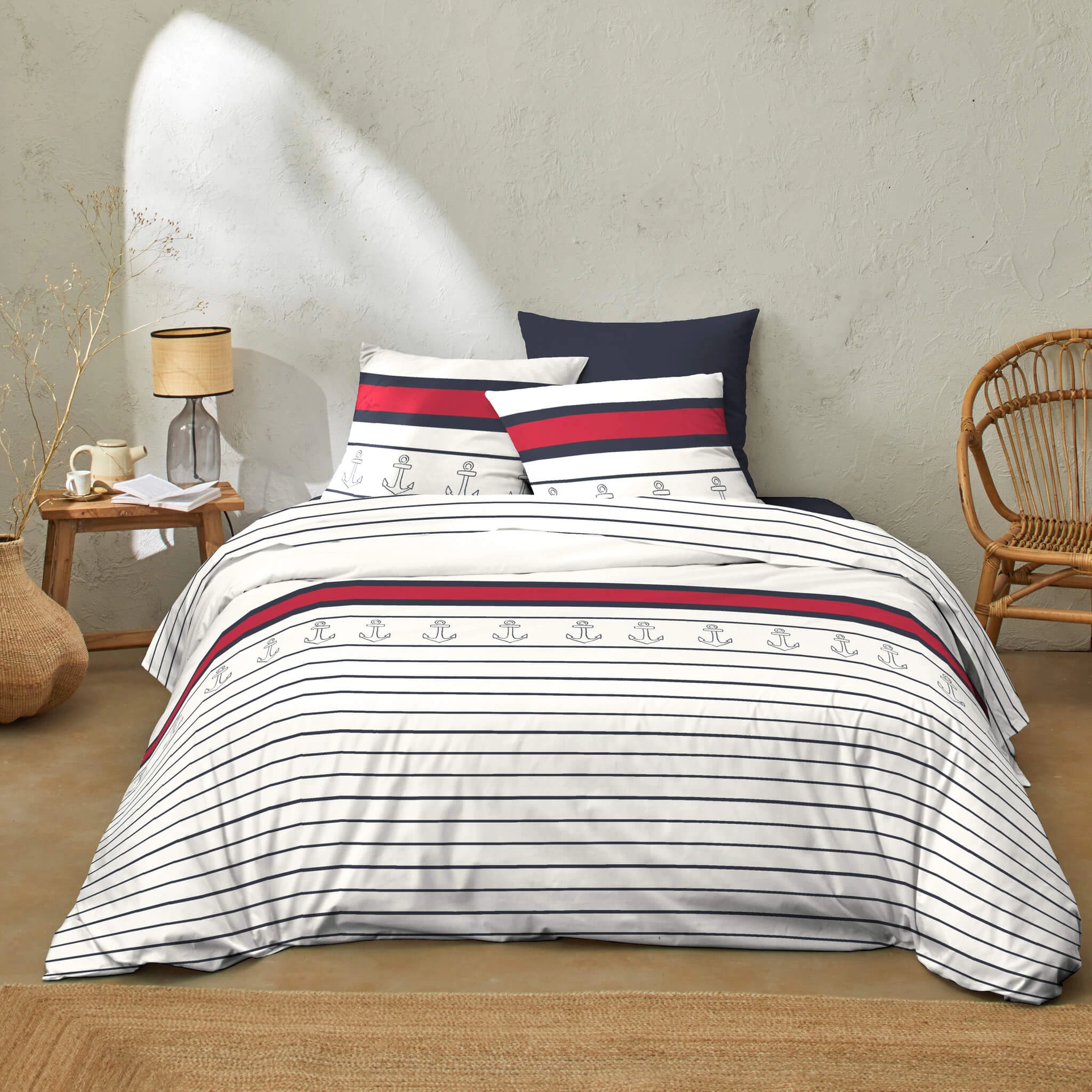 Optez pour la parure de lit Rade, de la marque Terre de Nuit. De simples liserĂ©s bleu marine sur un fond blanc pur permettent Ă cette parure de s’adapter Ă tous les univers de chambre. Pour parfaire le tout et donner une touche colorĂ©e Ă l’ensemble, vous retrouverez des motifs d’ancres ainsi qu’une bande rouge vif au centre de la housse de couette et des taies d’oreillers. Â