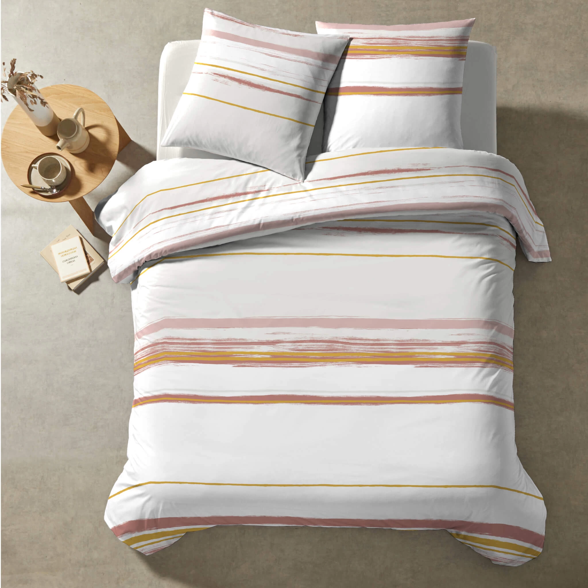 coloris rose, blanc et jaune, cette parure de lit dynamisera