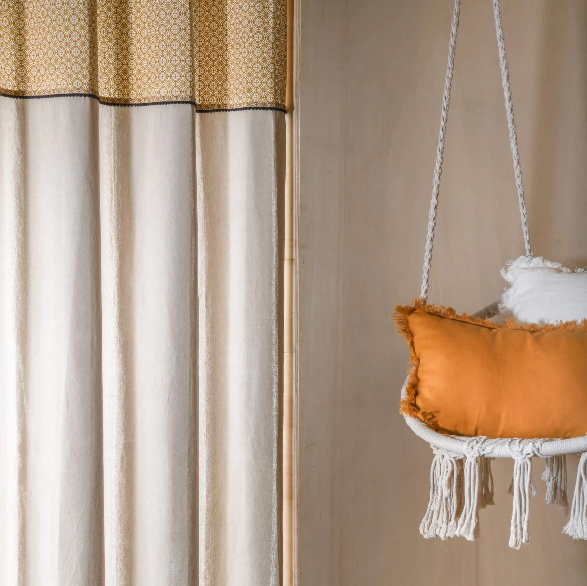 En matière de design, vous retrouverez une surface unie ainsi que des motifs dans un style bohème sur le haut du rideau.