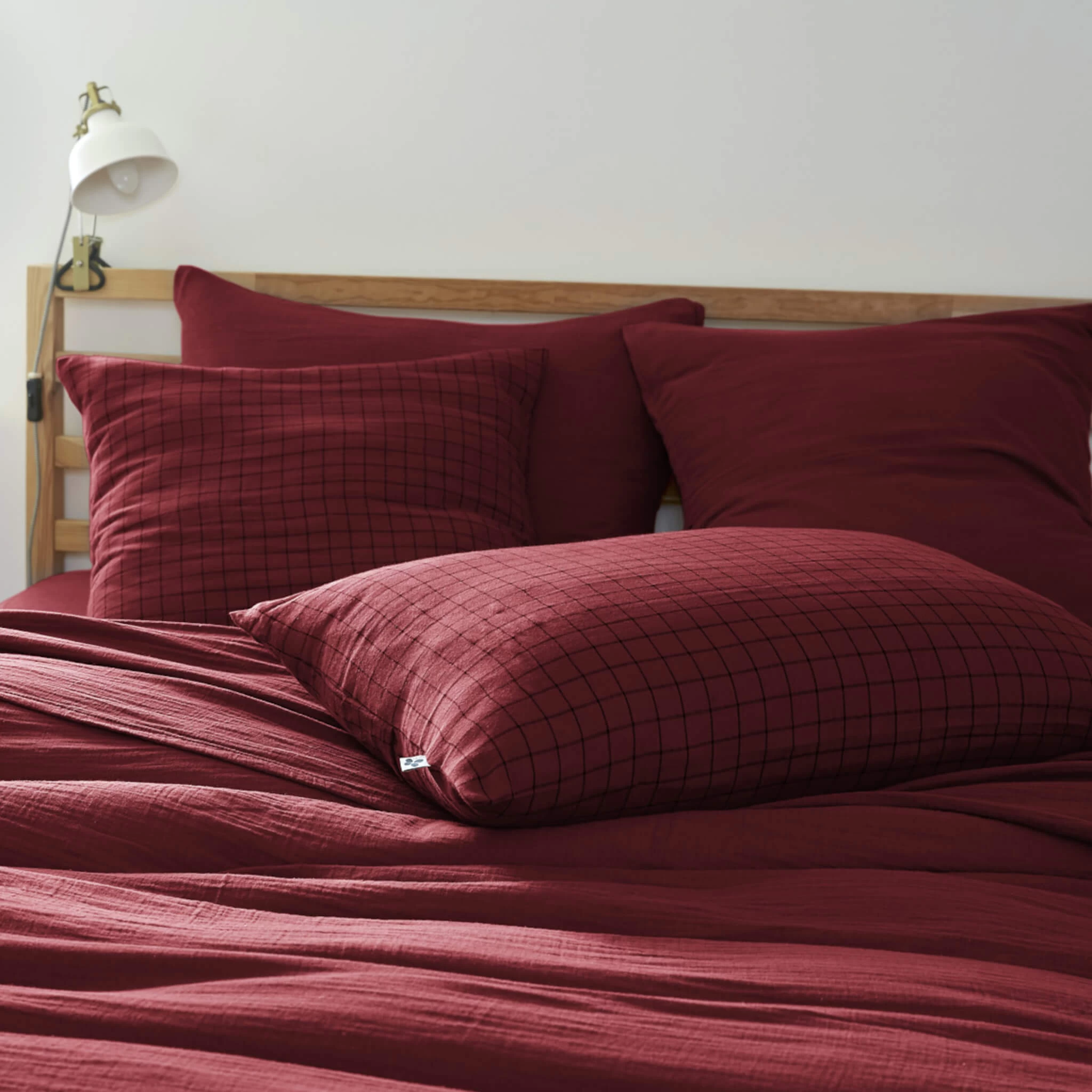 Taie d’oreiller Ă carreaux double gaze de coton bordeaux