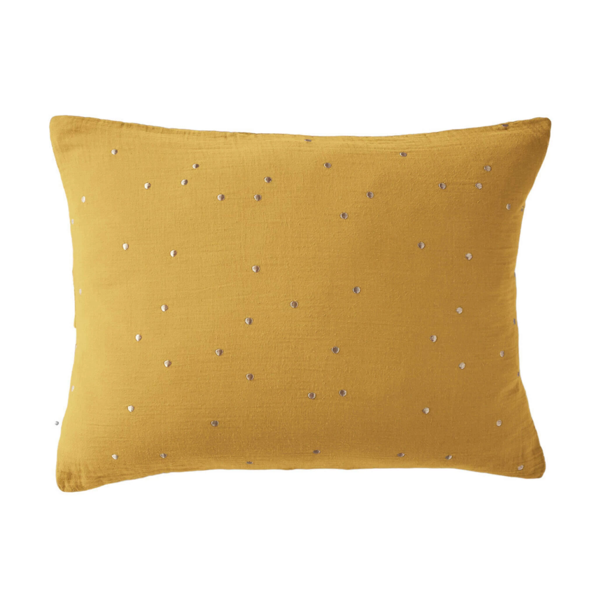 Taie d’oreiller à pois brodés double gaze de coton jaune safran