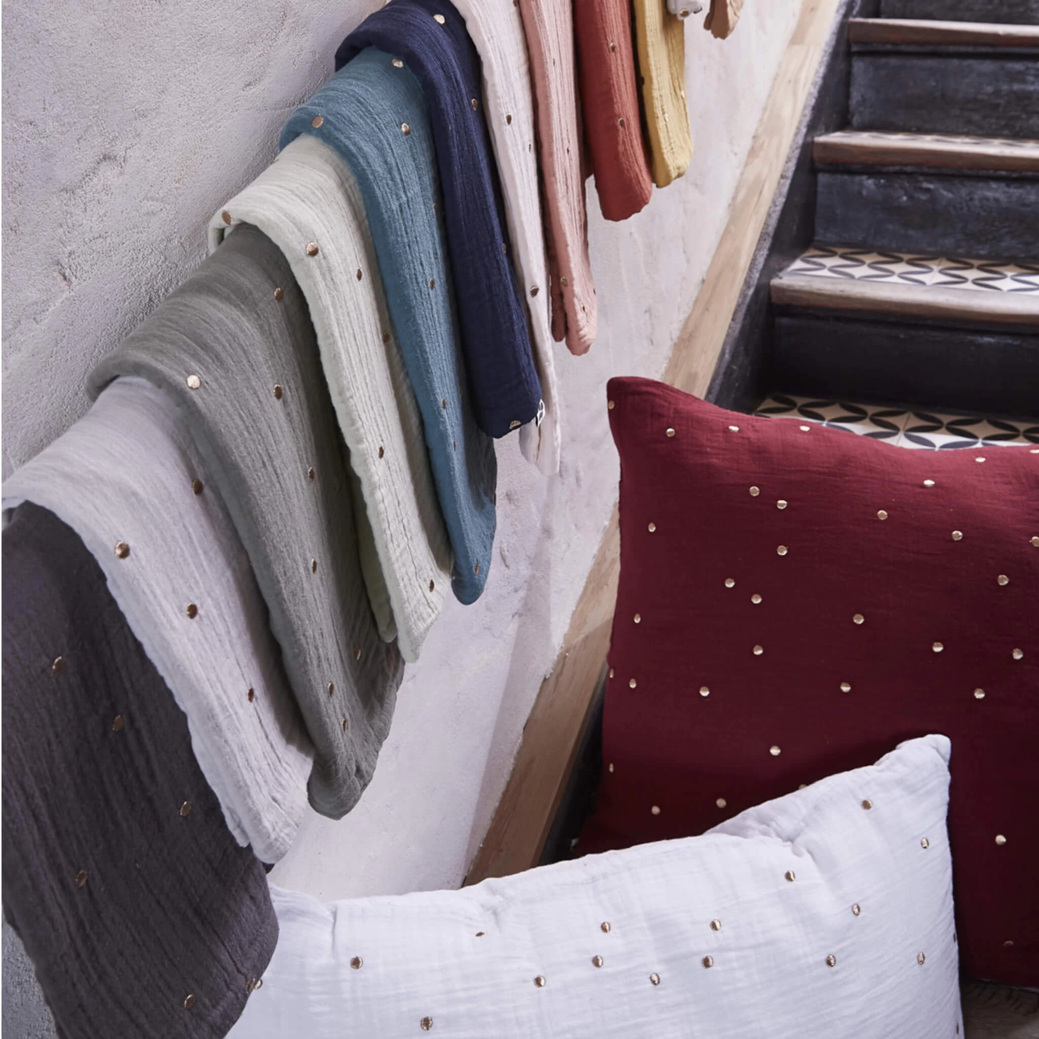 Taie d’oreiller à pois brodés double gaze de coton marine